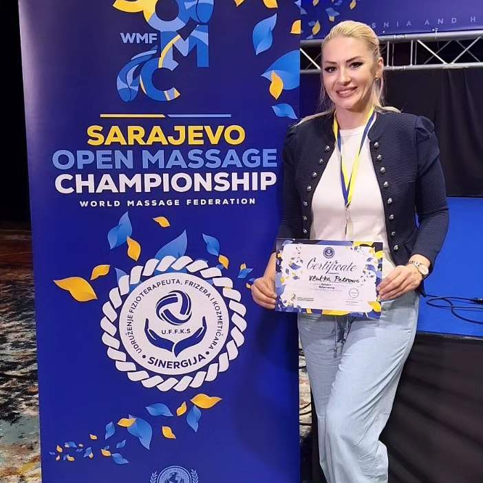 Prošlog vikenda u Sarajevu održan je BH Open massage Championship u organizaciji udruženja Sinergija, pod pokroviteljstvom World massage federation. Na šamponatu su učestvovali profesionalni maseri i fiziotetapeuti iz 24 zemlje sveta, a u Obrenovac za Srbiju, Vlatka nam donosi bronzu iz kategorije Wellness.