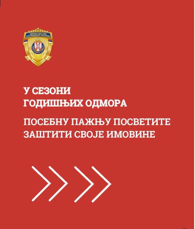 Ministarstvo unutrašnjih poslova Srbije apelovalo je danas na građane da u sezoni godišnjih odmora posebnu pažnju posvete zaštiti svoje imovine.