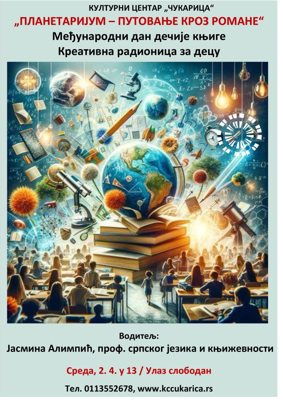 Povodom Međunarodnog dana knjige za decu, u sredu, 2. aprila sa početkom u 13 časova, Kulturni centar „Čukarica“ organizuje radionicu za učenike koja nosi naziv „Planetarijum-putovanje kroz romane“.