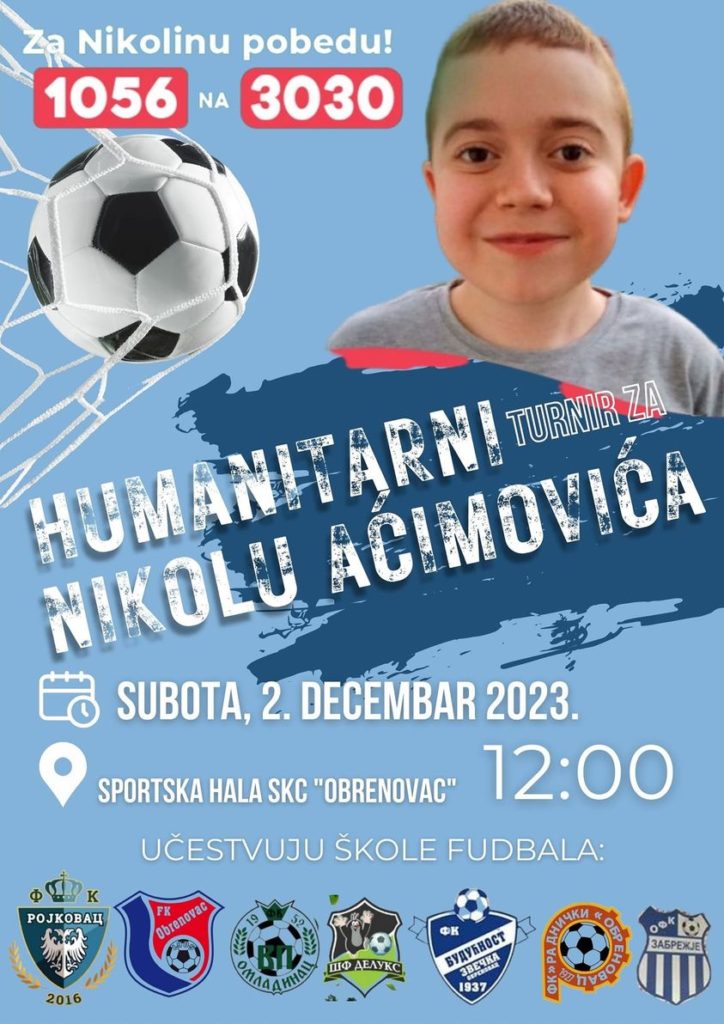 Obrenovac je godinama poznat po humanitarnim akcijama, a u subotu na inicijativu Dragane Pantelić ispred Tehničke škole, Fk Rojkovac i JP „SKC“ Obrenovac održaće se humanitarni turnir u malom fudbalu, a sav prihod namenjen je za lečenje Nikole Aćimovića, našeg malog sugrađanina i velikog borca.