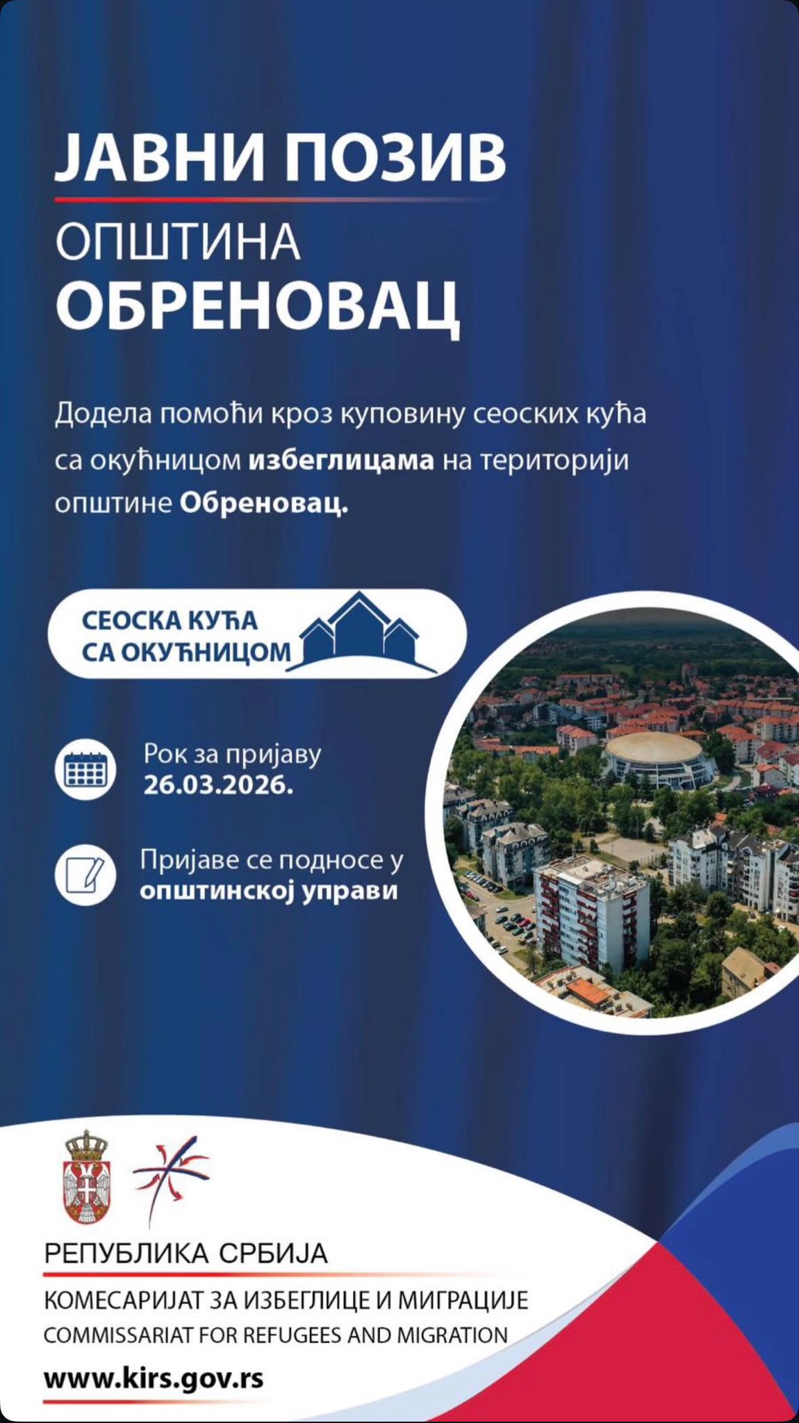 Gradska opština Obrenovac, u saradnji sa Komesarijat za izbeglice i migracije Republike Srbije, raspisala je dva javna poziva namenjena izbeglim i interno raseljenim licima koja žive na teritoriji opštine.